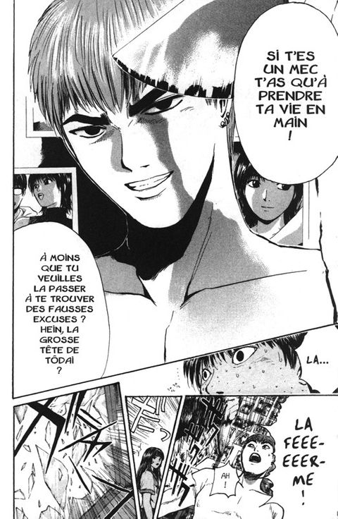 Teshigawara est devenu complètement fou et Onizuka va chercher à lui faire comprendre qu'il faut qu'il arrête de fuire la réalité et qu'il s'assume via une petite leçon nocturne. Malgré le fait d'avoir été blessé, Onizuka va quand même aidé Teshigawara à devenir meilleur et à ne pas se suicider. A la (...) Voir le commentaire