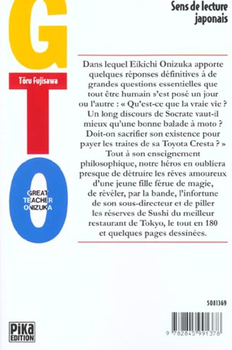 Dans lequel Eikichi Onizuka apporte quelques réponses définitives à de grandes questions essentielles que tout être humain s'est posé un jour ou l'autre : « Qu'est-ce que la vraie vie ? Un long discours de Socrate vaut-il mieux qu'une balade à moto ? Doit-on sacrifier son existence pour payer les traites de sa Toyota Cresta ? » Tout à son enseignement philosophique, notre héros en oubliera presque de détruire les rêves amoureux d'une jeune fille férue de magie, de révéler, par la bande, l'infortune de son sous-directeur et de piller les réserves de Sushi du meilleur restaurant de Tokyo, le tout en 180 et quelques pages dessinées.\\0