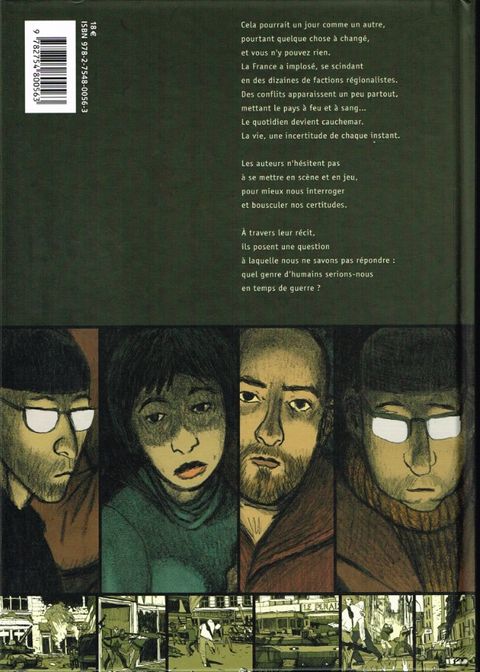 Cela pourrait être un jour comme les autres, pourtant quelque chose a changé, et vous n'y pouvez rien. La France a implosé, se scindant en des dizaines de factions régionalistes. Des conflits apparaissent un peu partout, mettant le pays à feu et à sang... Le quotidien devient cauchemar, la vie, une incertitude de chaque instant. Les auteurs n'hésitent pas à se mettre en scène et en jeu, pour mieux nous interroger et bousculer nos certitudes. A travers leur récit, ils posent une question à laquelle nous ne savons pas répondre : quel genre d'humains serions-nous en temps de guerre oe