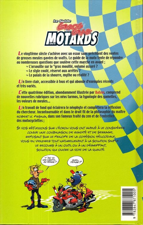 Le vingtième siècle s'est achevé avec un essor sans précédent des ventes de grosses meules gavées de watts. Ce guide Gaz-gaz de la moto tente de répondre aux nombreuses questions que soulève cette marche en avant ; l'arsouille sur le "" gras mouillé "", volume assuré ? le style coulé, réservé aux arretés ? le palais de la shourre, mythe ou réalité ? Un livre clair, accessible à tous et qui abonde d'exemples récents et très variés.\\0