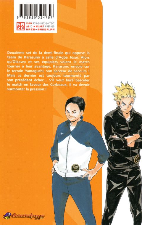 Malgré son pauvre mètre 63, Shôyô se donne à fond dans le sport qu'il aime : le volley-ball ! Son secret pour compenser sa petite taille : une détente phénoménale ! En intégrant le lycée Karasuno, notre rookie est déterminé à prendre sa revanche sur Tobio, qui l'avait humilié au collège. Mais en ouvrant les portes du gymnase, il découvre que son ennemi juré est son futur coéquipier ! Les deux recrues devront jouer en combinaison pour espérer redorer le blason du club, déchu de son rang de champion...