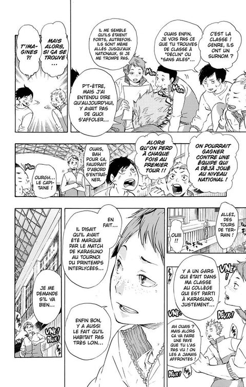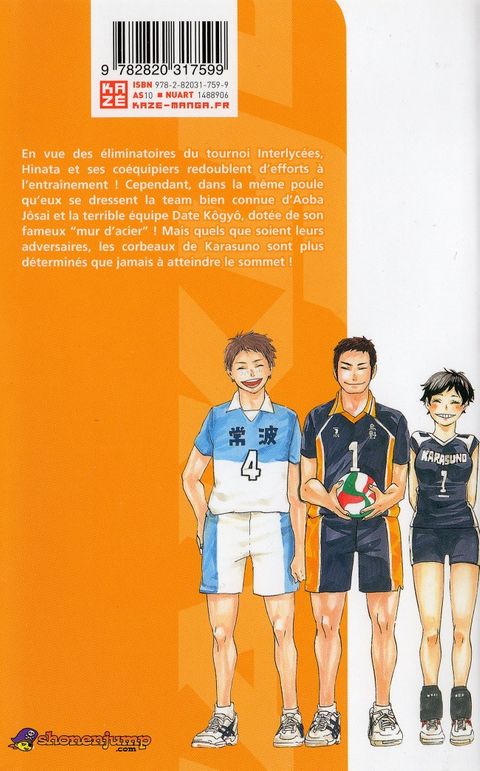 En vue des éliminatoires du tournoi Intercollèges, Hinata et ses coéquipiers redoublent d'efforts à l'entraînement ! Cependant, dans la même poule qu'eux se dressent la team bien connue d'Aoba Jôsai, et la terrible équipe Date Kôgyô, dotée de son fameux «mur d'acier» ! Mais quels que soient leurs adversaires, les corbeaux de Karasuno sont plus déterminés que jamais à atteindre le sommet !