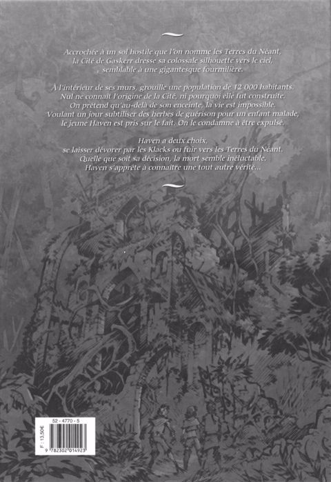 Nul ne connaît l'origine de la Cité de Gaskerr, ni pourquoi elle fut érigée. 12 000 habitants répartis sur 3 niveaux selon leur classe sociale y vivent en totale autarcie depuis des siècles. Il n'existe pas de prison à Gaskerr et, face au problème de surpopulation, l'expulsion est un excellent moyen de contrôler la démographie. Le jeune Haven vit dans les Terres Basses de Gaskerr. Pris en fl agrant délit de vol, il est expulsé. Haven a deux choix, se laisser dévorer vivant ou tenter de fuir vers les Terres du Néant où la vie est semble-t-il impossible.