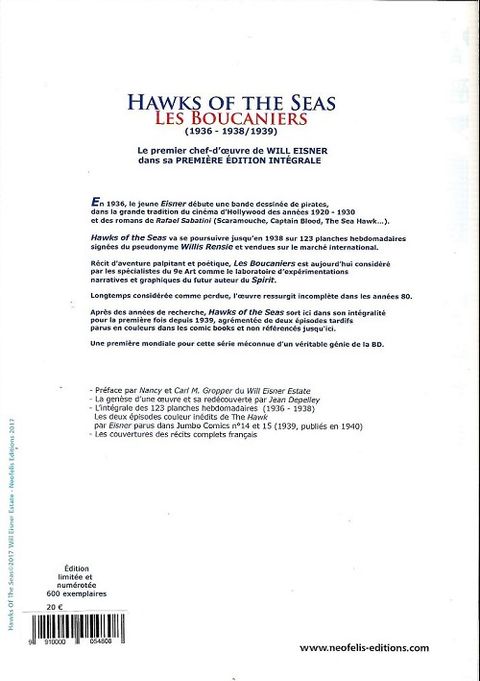 Retrouvez enfin l'intégralité des strips de la série de Will Eisner, Hawks of the Seas, publiée entre 1936 et 1939. Une première mondiale pour cette série méconnue d'un véritable génie de la BD !- Préface par Nancy et Carl M. Gropper du Will Eisner Estate- La genèse d'une œuvre et sa redécouverte par Jean Depelley- L'intégrale des 123 planches hebdomadaires (1936-1938) - Les deux épisodes couleur inédits de The Hawk par Eisner parus dans Jumbo Comics n°14 et 15 (1939, publiés en 1940) - Les couvertures des récits complets français