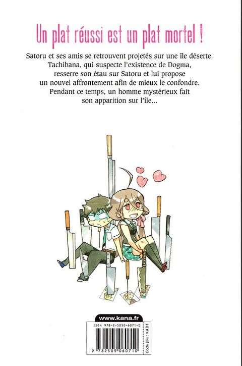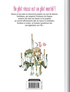 La petite troupe est toujours sur l'île déserte, mais les choses évoluent ! Ere et Sagane se trouvent un point commun, Morisaki reprend courage pour tenir sa promesse à son frère et Tachibana veut refaire un duel contre Satoru (possédé par Dogma). Notre héros apprend par la même occasion que leur amitié était fausse. Durant la nuit il s'égare et se retrouve avec Dogma dans une mystérieuse grotte, que ce dernier à l'air de connaître. Tandis que Tachibana est en position de faiblesse . Une amitié naît, une autre se perd, une menace apparaît ! Nos cuisiniers en herbe ne sont pas au bout de leur surprises !