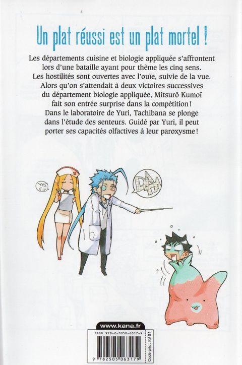 Les départements cuisine et biologie appliquée s'affrontent lors d'une bataille ayant pour thème les cinq sens. Les hostilités sont ouvertes avec l'ouïe, suivie de la vue. Alors qu'on s'attendait à deux victoires successives du département biologie appliquée, Mitsurô Kumoï, fait son entrée surprise dans la compétition ! Dans le laboratoire de Yuri, Tachibana se plonge dans l'étude des senteurs. Guidé par Yuri, il peut porter ses capacités olfactives à leur paroxysme !