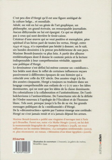C'est peu dire d'Hergé qu'il est une figure ambiguë de la culture belge... et mondiale. Adulé, on voit en lui un génie, un philosophe, un grand écrivain, un remarquable journaliste. Aucun titre dithyrambique n'est épargné au créateur de Tintin. Ce qui ne déplaît pas à ceux qui sont derrière le tiroir-caisse. Auteur d'une oeuvre qui se veut positive et exemplaire, père spirituel d'un héros doté de toutes les vertus, Hergé a cependant trempé dans la collaboration avec les nazis, a eu des " penchants " antisémites, fut l'auteur de livres destinés à la jeunesse faisant l'apologie du colonialisme. Il s'inspira d'un pamphlet fasciste pour dessiner son Tintin au Pays des Soviets. C'est cette face cachée que Maxime Benoît-Jeannin dévoile mais il va plus loin. Il montre que ces choix politiques n'étaient pas des accidents de parcours. Il se penche sur l'idéologie du personnage et montre, à travers ses albums en particulier, qu'Hergé n'a jamais renoncé à ses convictions, même après guerre. L'auteur détricote, avec originalité et sens critique, l'oeuvre d'Hergé. Il démontre que le masque imposé par les nécessités du marché d'après-guerre dissimule mal la réalité. Hergé n'a jamais renié ce qu'il était et il n'a jamais déposé les armes.