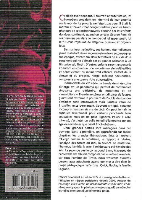 Les grands thèmes et tous les résumés des albums d'Hergé !De manière instinctive,George Rémi, éternellement jeune mais doté d'une sagesse naturelle, va accompagner son époque et donner naissance à un fils universel, Tintin. D'autres enfants seront engendrés et auront en commun une volonté morale indéfectible et bénéficieront du même trait efficace. Enfant de la vitesse et du progrès, Hergé, créateur hors-norme, composera une œuvre riche et accessible. Deux grandes parties dans cet ouvrage : la première présente les grandes thématiques liées à l'univers d'Hergé comme le scoutisme, le rapport à l'Autre, l'analyse des forces du mal, la science en mutation, l'humour, l'amitié, le sexe, l'architecture et l'histoire des arts. La seconde correspond à un résumé de chacun des albums, sans oublier d'autres personnages attachants comme Quick, Flupke, la famille Legrand. Indissociable du XXe siècle, la bande dessinée d'Hergé permet de contempler cinquante ans d'Histoire, de mutations et de " révolutions ". Bien des systèmes ont disparu, de fausses gloires ont retrouvé la poussière de l'oubli, des bandes dessinées sont introuvables mais l'auteur venu de Bruxelles reste permanent.