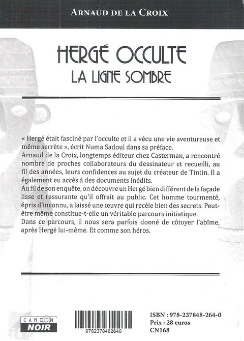 « Hergé était fasciné par l'occulte et il a vécu une vie aventureuse et même secrète », écrit Numa Sadoul dans sa préface. Arnaud de la Croix, longtemps éditeur chez Casterman, a rencontré nombre de proches collaborateurs du dessinateur et recueilli, au fil des années, leurs confidences au sujet du créateur de Tintin. Il a également eu accès à des documents inédits. Au fil de son enquête, on découvre un Hergé bien différent de la façade lisse et rassurante qu'il offrait au public. Cet homme tourmenté, épris d'inconnu, a laissé une oeuvre qui recèle bien des secrets. Peutêtre même constitue-t-elle un véritable parcours initiatique. Dans ce parcours, il nous sera parfois donné de côtoyer l'abîme,après Hergé lui-même. Et comme son héros.