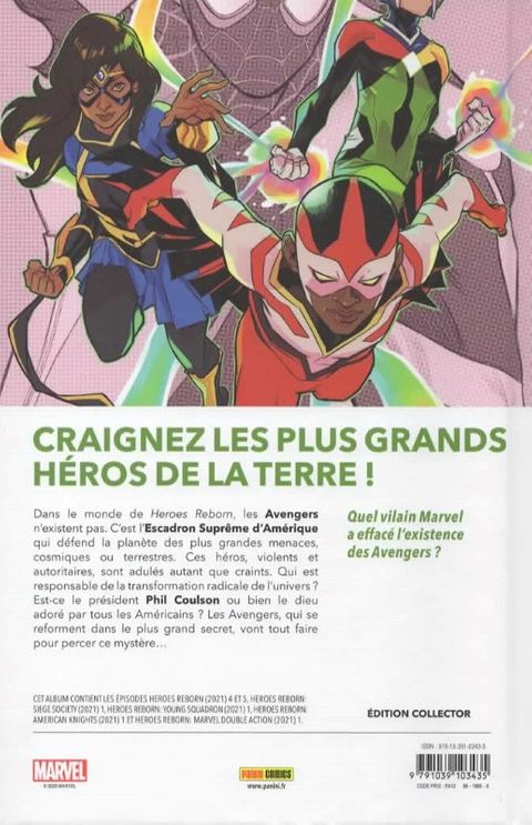 Dans ce monde où les Avengers n'existent pas (ils ont été remplacés par l'Escadron Suprême d'Amérique), les vilains eux sont toujours là, mais ils ne ressemblent pas tout à fait à ceux que nous connaissons. Docteur Spectrum affronte Rocket Raccoon ! Nighthawk combat le Bouffon ! Power Princess visite les ruines d'Asgard ! Et qu'arrive-t-il au nouveau Starbrand ? Située dans la droite ligne de la série Avengers publiée dans AVENGERS UNIVERSE, l'événement Heroes Reborn s'amuse des parallèles entre les plus grands héros Marvel et leurs homologues de la Distinguée Concurrence : la Ligue de Justice d'Amérique, dont l'Escadron Suprême s'inspire de façon évidente. Une aventure palpitante qui fait tomber les barrières entre les différents univers comics.