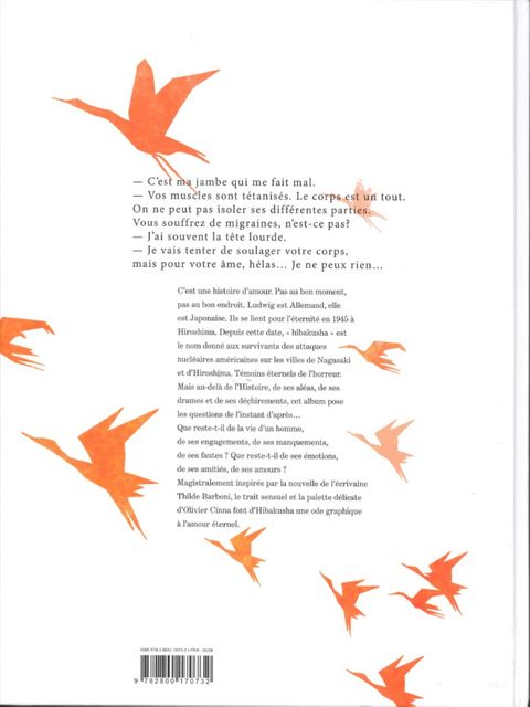 Ludwig Mueller est un traducteur-interprète allemand aux ordres du parti hitlérien. Alors que la Seconde Guerre mondiale entame un virage inquiétant, ce mari désabusé et père peu préoccupé par sa famille est envoyé à Hiroshima afin de travailler sur des documents confidentiels, au contenu crypté. Là-bas, il lui est cependant impossible d'échapper à ses tourments qui se gravent dans sa chair et lui causent d'intenses douleurs. C'est alors que sa rencontre avec une belle Japonaise va bouleverser toutes ses convictions, jusqu'au plus profond de son âme... L'année 1945 a sans doute été la plus sombre de l'histoire du Japon. En situant son intrigue à cette période charnière (hibakusha se traduit par "les survivants de la bombe"), Thilde Barboni rend un vibrant hommage à une nation souvent meurtrie, dont l'aura solennelle rayonne encore et toujours à travers les imaginaires. Une oeuvre sublimée par le trait d'Olivier Cinna, qui offre à ce récit entre fiction et réalité historique la force subtile et la pure délicatesse d'un magnifique haïku.