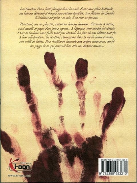 Les ténèbres d'une forêt plongée dans la nuit. Sous une pluie battante, un homme déterminé traque une victime terrifiée. La décision de Seiichi Kirishima est prise : ce soir, il va tuer sa femme. Pourtant, un an plus tôt, c'était un homme heureux. Ecrivain à succès, mari comblé et papa d'un jeune garçon : à l'époque, tout semble lui réussir. Mais ce bonheur sans faille n'est pas éternel. Le jour où son éditeur met fin à leur collaboration, les ténèbres s'immiscent dans la vie du jeune écrivain, vite criblé de dettes. Une terrifiante descente aux enfers commence, au fil des pages de ce qui pourrait bien être son dernier roman...