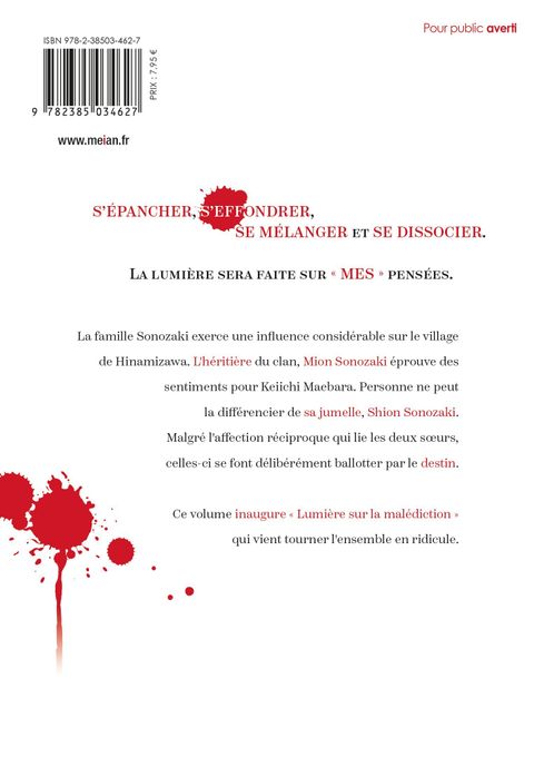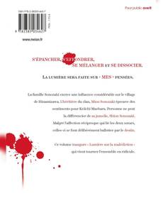 La famille Sonozaki exerce une influence considérable sur le village de Hinamizawa. L'héritière du clan, Mion Sonozaki éprouve des sentiments pour Keiichi Maebara. Personne ne peut la différencier de sa jumelle, Shion Sonozaki. Malgré l'affection réciproque qui lie les deux soeurs, celles-ci se font délibérément ballotter par le destin. Ce volume inaugure " Lumière sur la malédiction " qui vient tourner l'ensemble en ridicule.S'épancher, s'effondrer, se mélanger et se dissocier.La lumière sera faite sur " mes " pensées.Les jumelles sont tourmentées par leur conscience. Qui de l'aînée ou de la cadette... se transformera en démon ?Celle qui a tout vu et connaît l'avenir blêmit tandis que l'on se joue d'elle.