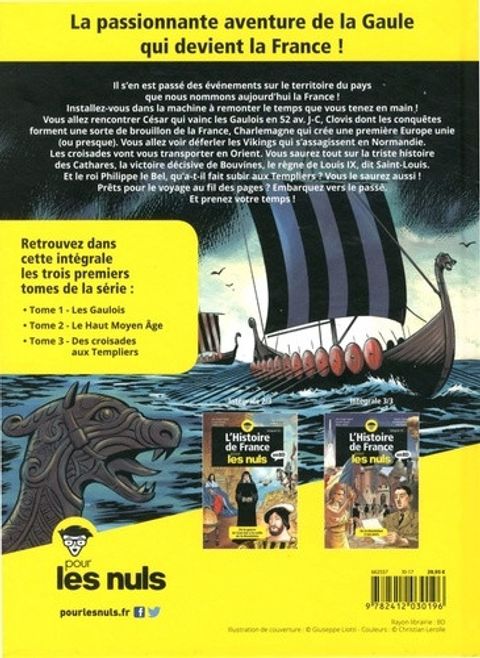 Retrouvez dans cette première intégrale de la série L'Histoire de France en BD pour les Nuls la période couverte par les trois premiers tomes : Des premiers hommes à Clovis (511 ap. J-C) ; De Clovis à Hugues Capet (987) ; Des Croisades aux Templiers (1326 : mort de Charles IV le Bel). Pour apprendre l'histoire en coinçant la bulle, avec les Nuls !