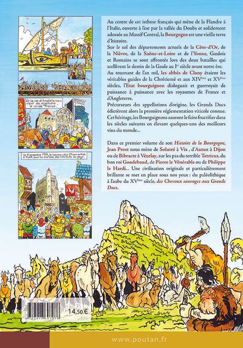 Jean PROST HISTOIRE DE LA BOURGOGNE Première partie : Des Chevaux sauvages aux Grands Ducs Album cartonné de 48 pages en couleurs,format 21 X 30 cm. Prix public : 14,50 € Au centre de cet isthme français qui mène de la Flandre à l’Italie, ouverte à l’est par la vallée du Doubs et solidement adossée au Massif Central, la Bourgogne est une vieille terre d’histoire.Sur le sol des départements actuels de la Côte-d’Or, de la Nièvre, de la Saône-et-Loire et de l’Yonne, Gaulois et Romains se sont affrontés lors des deux batailles qui scellèrent le destin de la Gaule au Ier siècle avant notre ère. Au tournant de l’an mil, les abbés de Cluny étaient les véritables guides de la Chrétienté et aux XIVème et XVème siècles, l’Etat bourguignon dialoguait et guerroyait de puissance à puissance avec les royaumes de France et d’Angleterre.Précurseurs des appellations d’origine, les Grands Ducs édictèrent alors la première réglementation viticole connue. Cet héritage, les Bourguignons sauront le faire fructifier dans les siècles suivant en élevant quelques-uns des meilleurs vins du monde...Dans ce premier volume de son Histoire de la Bourgogne, Jean Prost nous mène de Solutré à Vix, d’Autun à Dijon ou de Bibracte à Vézelay ; sur les pas du terrible Tetricus, du bon roi Gondebaud, de Pierre le Vénérable ou de Philippe le Hardi... Une civilisation originale et particulièrement brillante se met en place sous nos yeux :du paléolithique à l’aube du XVème siècle, des Chevaux sauvages aux Grands Ducs.