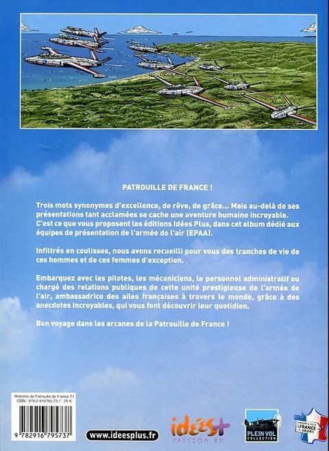 Á la lecture de cette BD, revivez les nombreuses aventures de ces anciens de la Patrouille de France. Du 17 Mai 1953 à nos jours, ces hommes et femmes d'exceptions ont écrits les plus belles pages de cette prestigieuse formation de l'Armée de l'Air qui est reconnue comme étant l'ambassadrice des ailes Françaises à travers le monde. Retrouvez le quotidien de ces pilotes, ces mécaniciens pour qui l'excellence et la précision sont la règle.