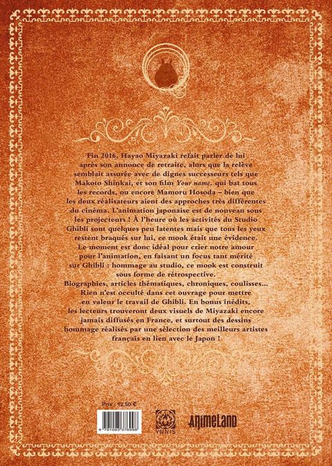 Fin 2016, Hayao Miyazaki refait parler de lui alors que la relève semblait assurée avec de dignes successeurs tels que Makoto Shinkai et son film your name. qui bat tous les records, ou encore Mamoru Hosoda... L'animation japonaise est sous les projecteurs ! À l'heure où les activités du Studio Ghibli sont quelques peu latentes mais que tous les yeux restent braqués sur lui, ce mook était une évidence. Le moment est donc idéal pour crier notre amour pour l'animation, en faisant un focus tant mérité sur Ghibli : hommage au studio, ce mook est construit sous forme de rétrospective. Biographies, articles thématiques, chroniques, coulisses... Rien n'est occulté dans cet ouvrage pour mettre en valeur le travail de Ghibli. En bonus inédits, les lecteurs trouveront deux visuels exclusifs du studio et surtout des dessins hommage réalisés par une sélection des meilleurs artistes français en lien avec le Japon !