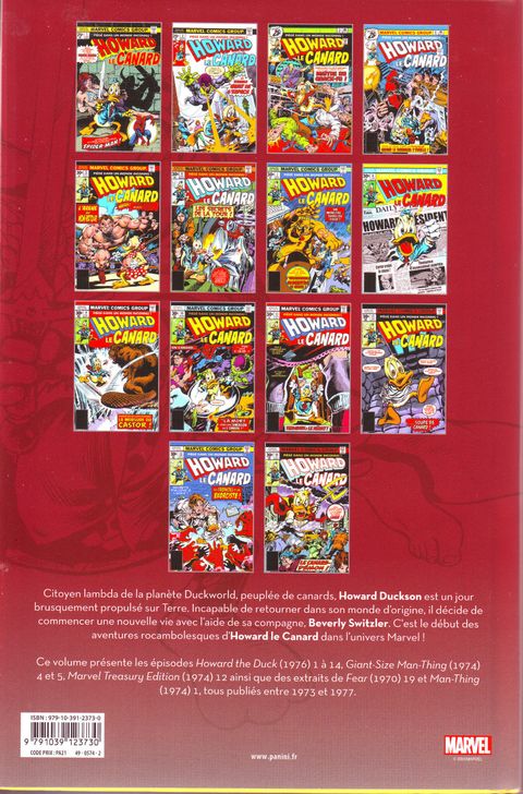 Le héros le plus improbable de l'univers Marvel se lance dans ses propres aventures ! Cigare au bec, Howard le Canard ne se contente pas d'aider l'Homme-Chose à protéger Cleveland. Avec son amie Beverly, il affronte les adversaires les plus surréalistes, fait équipe avec Spider-Man et se présente à la présidence des États-Unis ! Voici sans doute la collection INTÉGRALE la plus inattendue de notre catalogue, et pourtant de nombreux fans l'espéraient ! La série satirique de Steve Gerber n'a jamais été publiée en France, mais le héros est bel et bien identifié par le grand public, grâce à un film sorti dans les années 80 et à un personnage qui repointe son nez dans les séries les plus absurdes de la Maison des Idées. Voici enfin l'occasion de découvrir ce qui a fait d'Howard un personnage culte !
