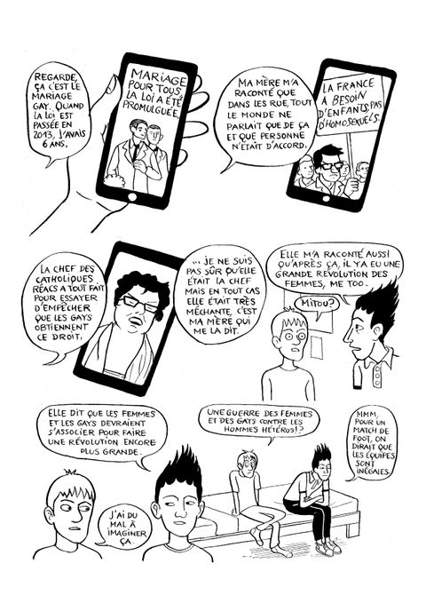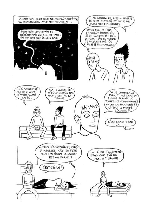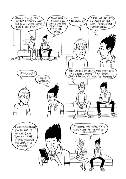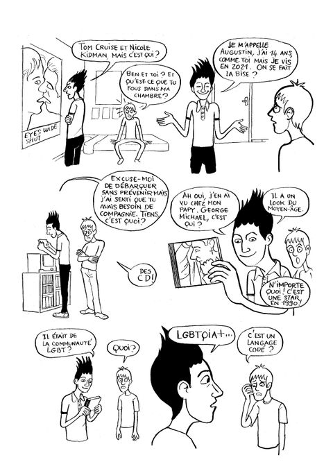 Hugo, un collégien des années 1990, se sent différent des autres garçons de son âge. En fait, il se demande même s'il ne serait pas homo... Mais comment en être sûr ? De quelles ressources un jeune de 14 ans qui grandit à la fin du 20e siècle dispose-t-il pour trouver la réponse à ses questions ? Vers qui se tourner ? Il est en proie aux doutes, et son environnement ne semble pas tout à fait prêt à accepter sa spécificité. Alors quand Augustin, 14 ans lui aussi, débarque dans sa vie, tout droit arrivé de 2021, c'est le choc. Les deux adolescents comparent leurs vies respectives, et c'est Augustin qui rassure Hugo et l'aide à comprendre son orientation sexuelle. Petit à petit, à grand renfort de recherches, d'expériences et surtout de discussions avec son nouvel ami du futur, Hugo va parvenir à s'accepter tel qu'il est. Augustin lui fera ainsi découvrir la conception de l'homosexualité qui sera celle des années à venir... En attendant, Hugo doit traverser des étapes délicates : son coming-out auprès de ses parents, ses premiers émois amoureux, des tentatives de "guérison" . Il réalisera également qu'Augustin, en 2021, n'échappe pas non plus complétement à ces questionnements et difficultés, en dépit des progrès majeurs effectués en termes de droits LGBT.