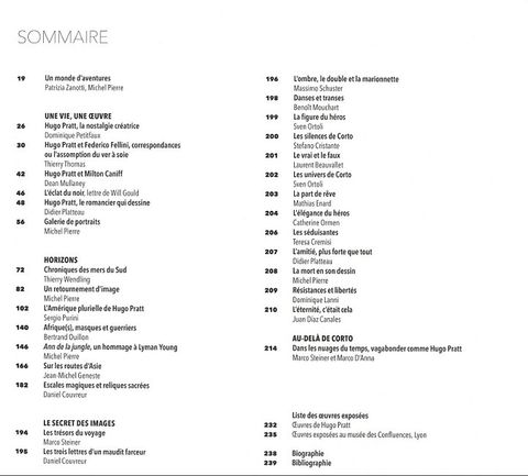 Publié à l'occasion de l'exposition Hugo Pratt, lignes d'horizons au musée des Confluences, à Lyon, du 7 avril 2018 au 24 mars 2019. Un dialogue avec une œuvre majeure. Entre les lignes d'horizon et le temps des escales, l'œuvre de Hugo Pratt (1927-1995) interroge les géographies et les cultures du monde. Cette œuvre est graphique et littéraire mais est également liée au cinéma et à d'anciennes traditions occidentales. Les albums de Hugo Pratt sont enrichis de références liées aux collections ethnographiques muséales et dialoguent avec les témoins de civilisations multiples, au gré d'un créateur qui considérait la curiosité comme la première des qualités. L'ensemble de ce catalogue, très immersif, offre une traversée de l'œuvre de l'artiste grâce à de très nombreuses planches originales, voire inédites, des archives, des photographies, notamment du célèbre photographe suisse Marco D'Anna en adéquation avec l'univers esthétique de Hugo Pratt.