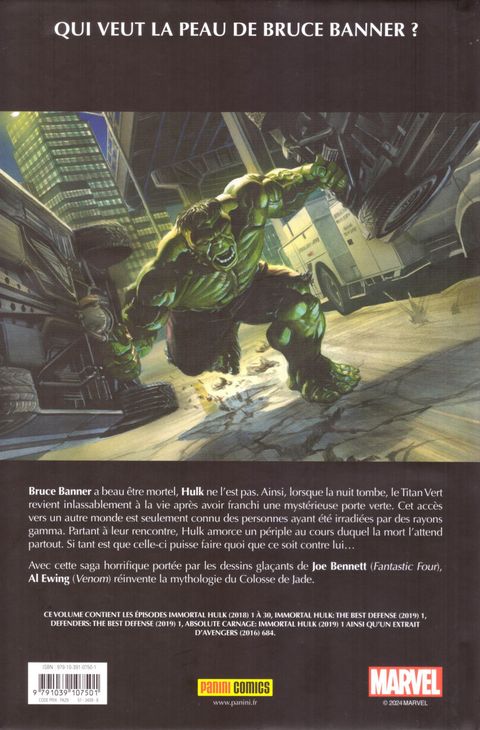 C'est un homme ou un monstre ? Ou les deux ? Chaque fois que Bruce Banner meurt, Hulk prend la relève. Traqué par le gouvernement, par Alpha Flight et par de nouveaux et mystérieux ennemis, Bruce a pourtant de plus gros problèmes. Quelque chose l'a infecté. Quelque chose qui a des projets terribles pour l'humanité. Et les réponses se trouvent derrière... la Porte Verte ! Avec Immortal Hulk, Al Ewing a réalisé un tour de force, un chef-d'oeuvre de l'horreur salué par les fans comme par la critique, et l'une des meilleures sagas consacrées à Hulk depuis que Peter David a quitté la série. Nous la recueillons aujourd'hui en deux albums OMNIBUS qui vous feront frissonner... de plaisir !