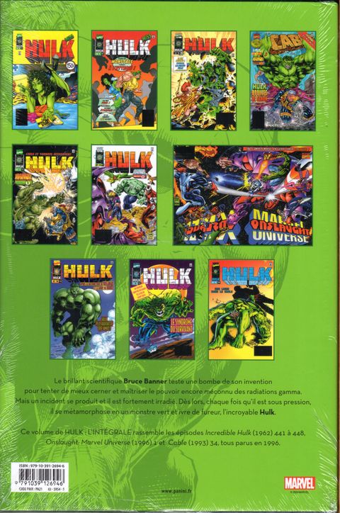 Comme si Hulk n'avait pas suffisamment de problèmes, le voilà embarqué dans la lutte contre Onslaught ! Le Professeur Xavier et Magnéto ont fusionné et forment une entité terrifiante et surpuissante, au point que tous les héros pourraient bien devoir se sacrifier pour l'arrêter. Et lorsque Hulk se retrouvera l'un des derniers sur Terre, souffrira-t-il du complexe du survivant selon vous ? Quand Panini Comics a repris la licence Marvel en France, en 1997, le formidable et long séjour de Peter David n'était toujours pas terminé. La moitié des épisodes recueillis ici n'ont pas été réédités depuis cette époque, à l'exception de ceux concernés par l'évènement Onslaught.