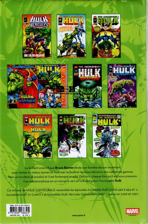 Alors que sa force devient incontrôlable, Hulk fonce tête baissée sur Hollywood ! Les Thunderbolts peuvent-ils intervenir ? Le veulent-ils d'ailleurs ? Les sombres prédictions du Maestro, qui avait annoncé à Hulk qu'il allait tout perdre, sont-elles en train de se réaliser ? Jusqu'où ira le Géant Vert pour qu'on le laisse enfin en paix ? Faudra-t-il l'intervention d'un autre Hulk pour le stopper ? Ou celle de Wolverine ? Nous approchons de la fin des INTÉGRALES consacrées à Hulk et scénarisées par Peter David ! Ce volume marque la réédition des tout premiers épisodes publiés par Panini à son arrivée sur le marché des comics... Ces histoires, magnifiquement illustrées par Mike Deodato Jr (Dark Avengers) et Adam Kubert (Wolverine), sont ainsi proposées pour la première fois depuis plus de 25 ans !