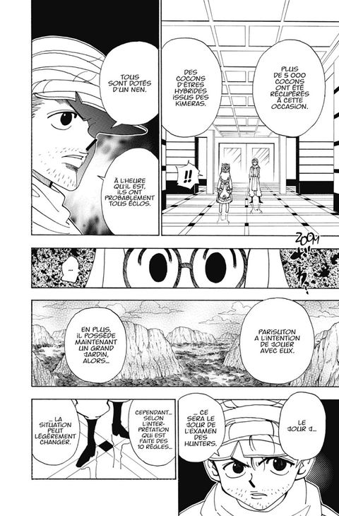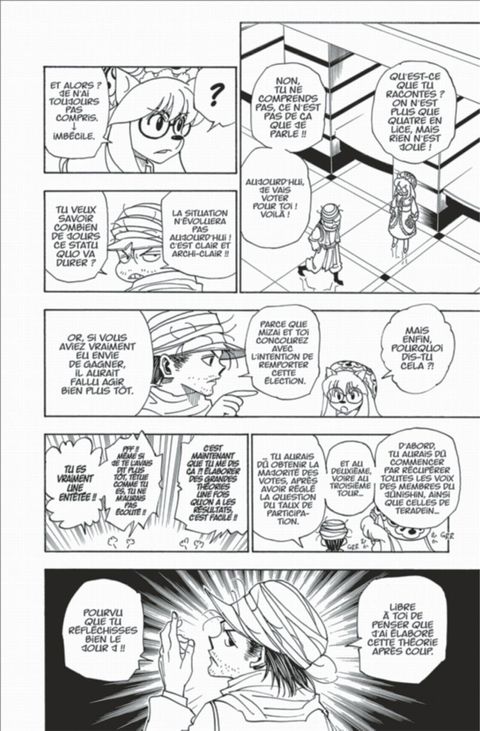 Il ne reste plus que quatre candidats en lice pour l'élection du nouveau président. Le vice-président Parisuton, Mizaisutomu, Chiidoru et Léolio... Qui sortira élu de ce mélange de complots et d'ambitions ? Pendant ce temps, Kirua et Aruka arrivent auprès de Gon. Parviendront-ils à le soigner ?!