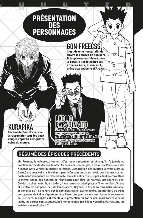 Dans les pas de son père, Gon quitte son village pour se présenter au difficile examen des hunters. En chemin, Gon se fera des amis. Mais survivront-ils à la première épreuve face à des participants particulièrement dangereux... ?! Si quelques adversaires se montrent impitoyables dès le début, d'autres comme Isoka le magicien font preuve d'un cruauté pour le moins inquiétante...