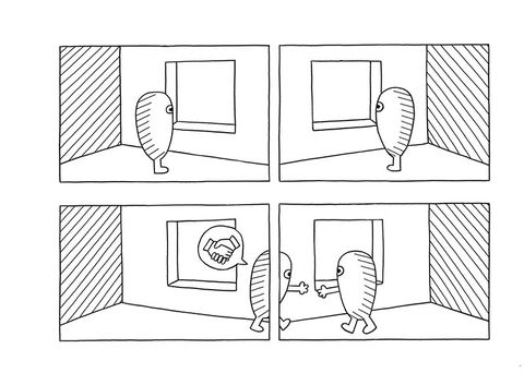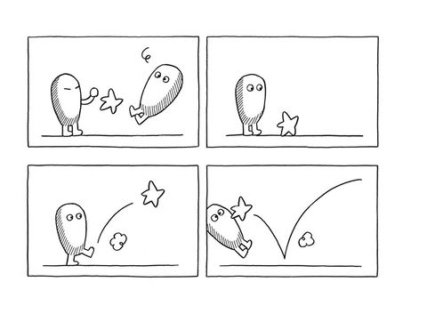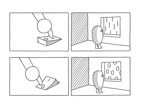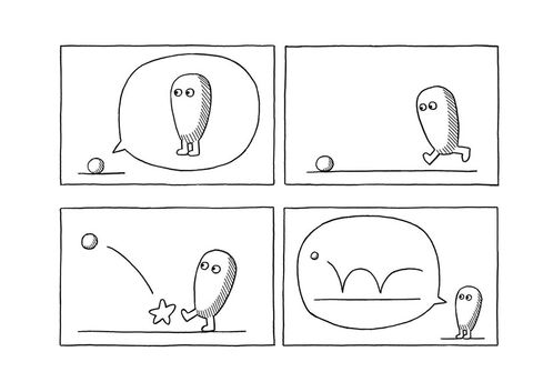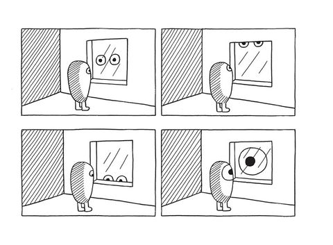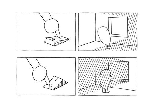 Les strips de José Parrondo fonctionnent comme des énigmes. Le trait est simple, les images épurées, le style minimaliste, l'attraction instantanée. Mais face à ces pages à priori muettes, les questions affluent : cette fenêtre est-elle un tableau ? Ce paysage est-il factice ou réel ? Cet arbre est-il plat ou en volume ? Y a-t-il un Eggman ou plusieurs ? Est-il ici ou ailleurs ? L'action se déroule-t-elle à l'extérieur ou à l'intérieur ? Ce qui nous regardons est-il vraiment ce que nous voyons ? Autant de questions que chaque lecteur devra négocier avec son moi profond pour en découvrir le non-sens qui mène au rire véritable. Eggman, petit oeuf doté de courtes pattes et de yeux ronds comme des billes, nous entraîne dans un univers insolite où les jeux d'échelle, le trompe-l'oeil et l'illusion règnent en maîtres. Tableau, longue-vue, fenêtre, escalier, serrure, bulles de bande dessinée, ronds, carrés, tirets parsèment ses aventures. En mêlant objets identifiables et éléments purement graphiques, José Parrondo s'amuse avec les signes et les codes de la bande dessinée pour créer un univers délicieusement absurde et plein de dissonances poétiques, tout en jonglant sans retenue avec la rétine et l'intelligence de ses lecteurs. Pour cet album, José Parrondo alterne à nouveau les techniques : aux strips muets en noir et blanc viennent s'ajouter une série de peintures à l'acrylique mélangeant dessins, jeux de mots ainsi que quelques photographies.