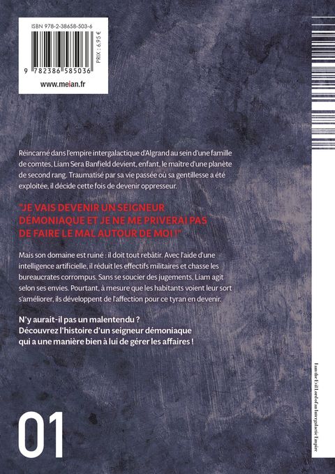 Et si tout le monde adorait le méchant ?Réincarné dans l'empire intergalactique d'Algrand au sein d'une famille de comtes, Liam Sera Banfield devient, enfant, le maître d'une planète de second rang. Traumatisé par sa vie passée où sa gentillesse a été exploitée, il décide cette fois de devenir oppresseur."Je vais devenir un seigneur démoniaque et je ne me priverai pas de faire le mal autour de moi !"Mais son domaine est ruiné : il doit tout rebâtir. Avec l'aide d'une intelligence artificielle, il réduit les effectifs militaires et chasse les bureaucrates corrompus. Sans se soucier des jugements, Liam agit selon ses envies. Pourtant, à mesure que les habitants voient leur sort s'améliorer, ils développent de l'affection pour ce tyran en devenir.N'y aurait-il pas un malentendu ? Découvrez l'histoire d'un seigneur démoniaque qui a une manière bien à lui de gérer les affaires !L'heure est venue d'emprunter (ou pas) la voie des ombres !!
