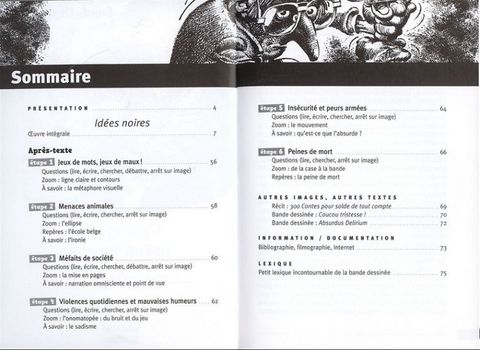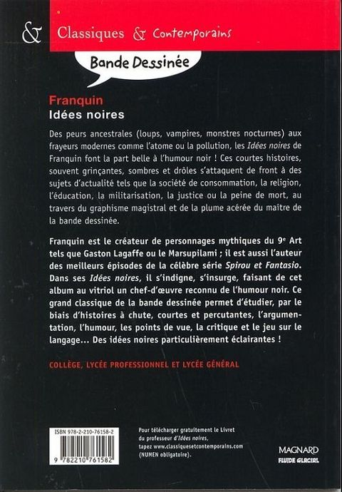 Des peurs ancestrales (loups, vampires, monstres nocturnes) aux frayeurs modernes comme l'atome ou la pollution, les Idées noires de Franquin font la part belle à l'humour noir ! Ces courtes histoires, souvent grinçantes, sombres et drôles s'attaquent de front à des sujets d'actualité tels que la société de consommation, la religion, l'éducation, la militarisation, la justice ou la peine de mort, au travers du graphisme magistral et de la plume acérée du maître de la bande dessinée. Dans ses Idées noires, Franquin s'indigne, s'insurge, faisant de cet album au vitriol un chef-d'oeuvre reconnu de l'humour noir. Ce grand classique de la bande dessinée permet d'étudier, par le biais d'histoires à chute, courtes et percutantes, l'argumentation, l'humour, les points de vue, la critique et le jeu sur le langage... Des idées noires particulièrement éclairantes