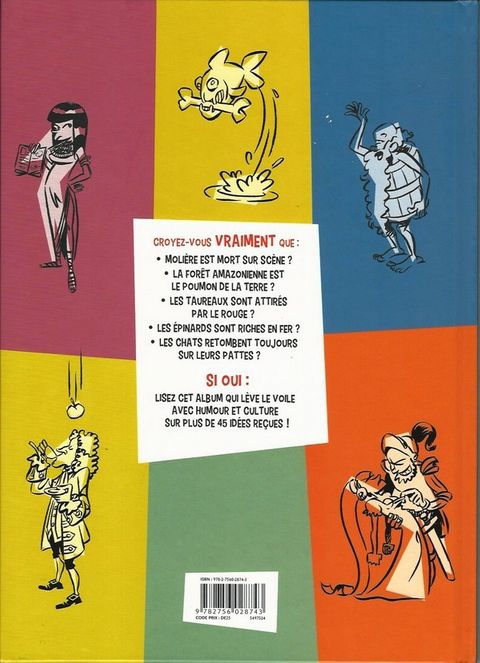 Pensez-vous que Molière est mort sur scène ? Qu'il y a plus d'accouchements à la pleine lune ? Que les taureaux sont attirés par le rouge ? Que les épinards sont riches en fer ? Que les chats retombent toujours sur leurs pattes ?... Si oui, lisez cet album ! En mélangeant gags et faits concrets, les auteurs dévoilent la vérité sur plus de 50 idées reçues totalement fausses.