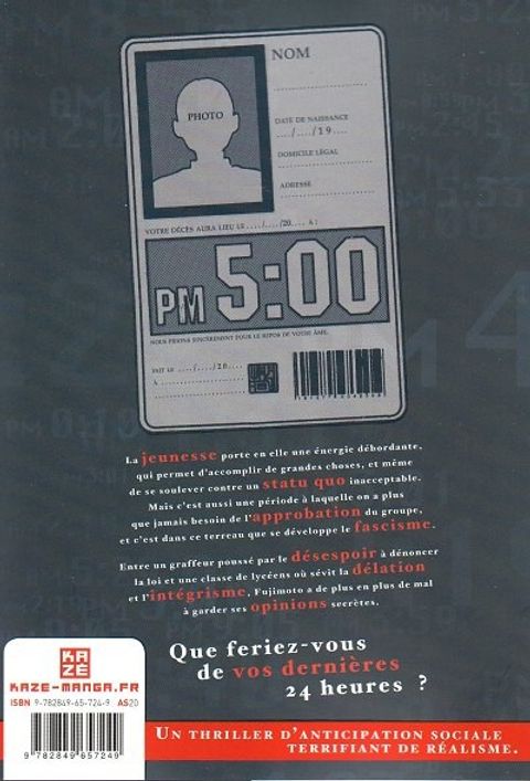 La jeunesse porte en elle une énergie débordante, qui permet d'accomplir de grandes choses, et même de se soulever contre un statu quo inacceptable. Mais c'est aussi une période à laquelle on a plus que jamais besoin de l'approbation du groupe, et c'est dans ce terreau que se développe le fascime. Entre un graffeur poussé par le désespoir à dénoncer la loi et une classe de lycéens où sévit la délation et 1'intégrisme, Fujimoto a de plus en plus de mal à garder ses opinions secrètes. Que feriez-vous de vos dernières 24 heures ?