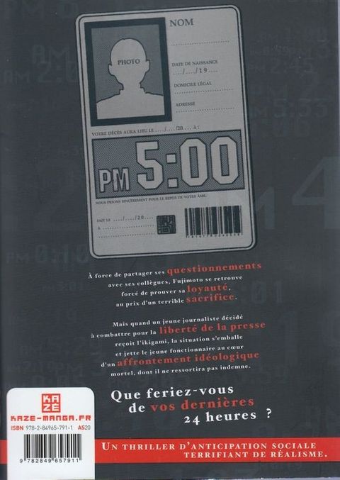 A force de partager ses questionnements avec ses collègues, Fujimoto se retrouve forcé de prouver sa loyauté, au prix d'un terrible sacrifice. Mais quand un jeune journaliste décidé à combattre pour la liberté de la presse reçoit l'ikigami, la situation s'emballe et jette le jeune fonctionnaire au coeur d'un affrontement idéologique mortel, dont il ne ressortira pas indemne. Que feriez-vous de vos dernières 24 heures ?