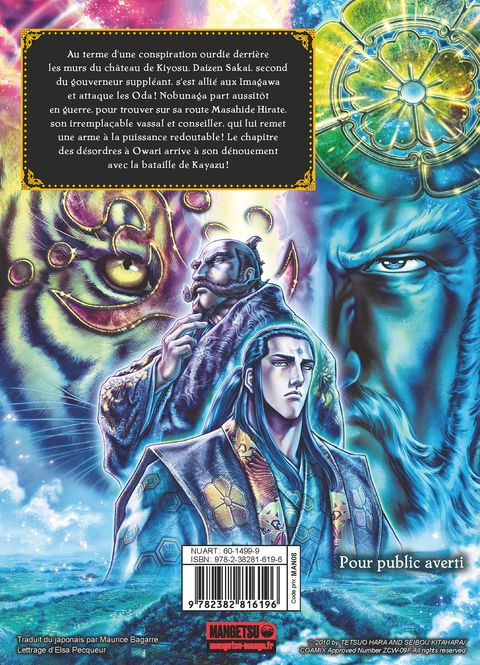 Au terme d'une conspiration ourdie derrière les murs du château de Kiyosu, Daizen Sakai, second du gouverneur suppléant, s'est allié aux Imagawa et attaque les Oda ! Nobunaga part aussitôt en guerre, pour trouver sur sa route Masahide Hirate, son irremplaçable vassal et conseiller, qui lui remet une arme à la puissance redoutable ! Le chapitre des désordres à Owari arrive à son dénouement avec la bataille de Kayazu ! Retrouvez la toute nouvelle série de Tetsuo Hara et Seibô Kitahara, ancien responsable éditorial du mangaka chez Shueisha, dans cette biographie romancée de la vie d'Oda Nobunaga.