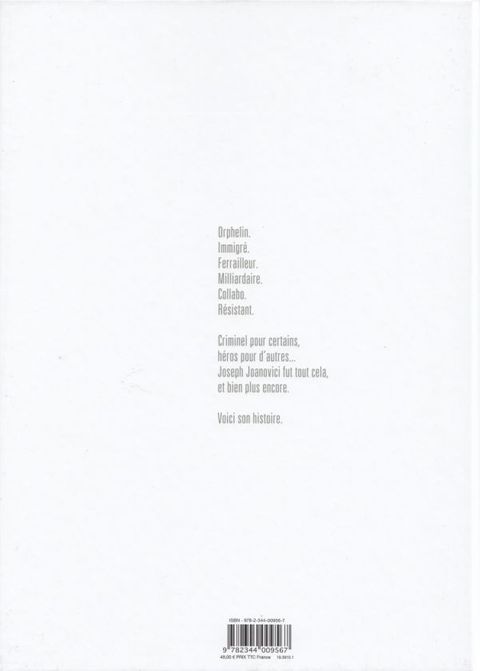 Orphelin. Immigré. Ferrailleur. Milliardaire. Collabo. Résistant. Criminel pour certains, héros pour d'autres... Joseph Joanovici fut tout cela et bien plus encore. De 2007 à 2012, Fabien Nury et Sylvain Vallée ont raconté le destin hors-norme de ce personnage à travers une formidable saga historique, adulée par la critique et le public : récompensée par de nombreux prix - dont celui de la Meilleure Série à Angoulême en 2012 - et vendue à près d'un million d'exemplaires.Le désormais incontournable Fabien Nury y a fait exploser sa science du scénario au grand jour. Sylvain Vallée s'y est affirmé comme un maître de la ligne claire moderne. Son style expressif et élégant prend encore une autre dimension dans cette version inédite intégralement en noir et blanc qui, d'un jeu de contrastes permanent, vient davantage souligner le destin ambigu de Joseph Joanovici, constamment tiraillé entre l'ombre et la lumière.En plus de la couverture, sept illustrations inédites ont été réalisées par Sylvain Vallée spécialement pour l'occasion afin d'ouvrir la page de titre du récit et les « chapitres » correspondant aux albums de la série. Proposée en petit format, au tirage unique de 10 000 exemplaires et à un prix abordable, cette intégrale est le cadeau idéal de fin d'année pour les bédéphiles, amateurs d'histoire ou de beaux dessins tout simplement.