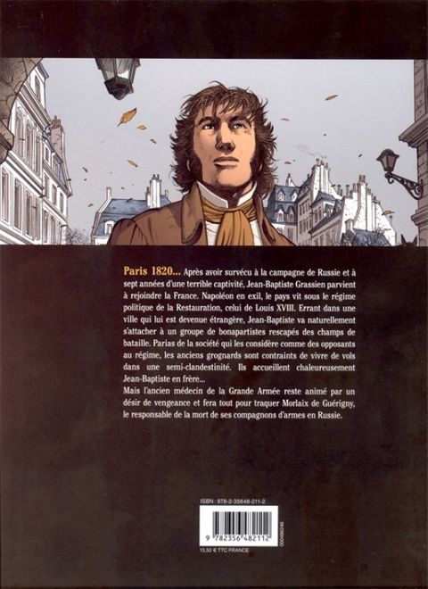 Jean-Baptiste Grassien, ancien médecin de la Grande Armée de Napoléon I, retrouve la France en 1820. Ses sept années de captivité en Russie l'ont détruit. Voir tous ses compagnons mourir les uns après les autres n'a eu pour effet que d'exacerber son désir de vengeance : il veut détruire Morlaix de Guérigny. Mais son pays natal est lui aussi transformé. Napoléon est exilé à Sainte Hélène, Louis XVIII règne. Les soldats de l'Empire sont dorénavant suspects. Jean-Baptiste, esseulé dans un Paris étranger, a besoin des siens. C'est tout naturellement qu'il retrouve donc des Bonapartistes rescapés des champs de bataille. Ces derniers ont choisi le vol comme moyen de subsistance : on ne veut plus d'eux dans cette société, cette société le paiera ! Mais Vidocq, le chef de la sûreté, ne partage pas leur conception de la reconnaissance