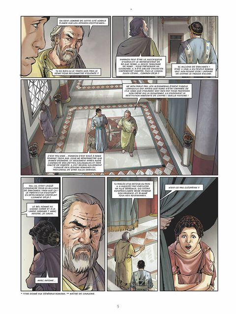 Un album pour la reine des reinesPersonnage iconique, presque légendaire, Cléopâtre est vue dans cet album à travers un point de vue inédit. Mal connue, cette reine, à l'intelligence hors du commun, érudite, charismatique, et d'origine grecque est l'un des pharaons les plus avisés de la fin de l'empire ptolémaïque. Son but avant tout est de restituer la gloire passée de l'empire égyptien, et pour cela elle doit impérativement composer avec Rome. Car la reine d'Egypte est également victime de la propagande romaine. Elle est haïe par les Romains surtout les Romaines ! pour deux principales raisons : tout d'abord, c'est une monarque riche et puissante, alors qu'à Rome, la république est chérie et les rois vus comme des tyrans. Puis, c'est une femme libre, autrement dit, une femme qui jouit de libertés interdites aux romaines : elle peut vivre seule, posséder des propriétés, hériter ou divorcer... tout ce qu'une romaine ne peut pas être.Pour la première fois, cette BD tient compte des deux faisceaux historiques (romains et égyptiens) pour tenter de raconter le véritable personnage derrière l'icône. Une femme forte qui fut une actrice fondamentale de l'histoire de l'Égypte mais aussi, de manière indirecte, de la chute de la République romaine.