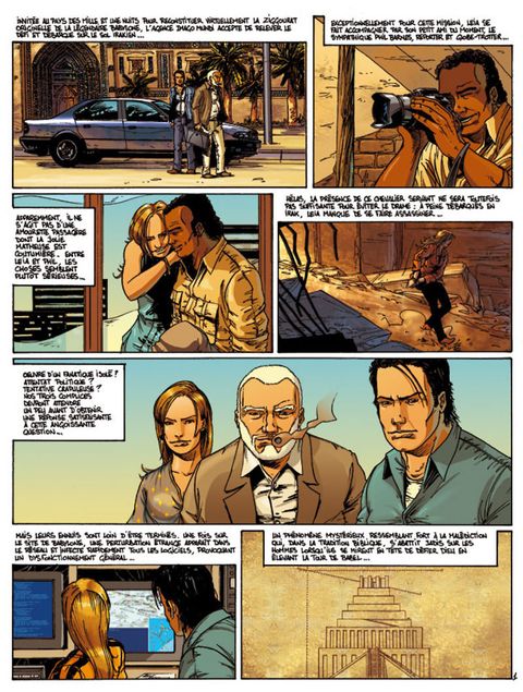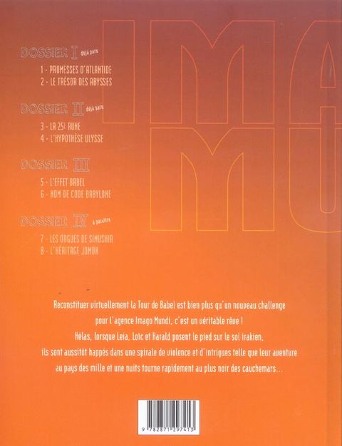La l'agence Imago Mundi en Irak se poursuit, mais les ennuis sont loin d'être terminés. Une fois sur le site de Babylone, une perturbation étrange apparaît, qui infecte tous les logiciels, et les tentatives de meurtre se multiplient. Provoquant un dysfonctionnement général du système informatique, un phénomène mystérieux se produit, ressemblant fort à la malédiction qui, dans la tradition biblique, s'abattit sur les hommes lorsqu'ils se mirent en tête de défier Dieu en érigeant la Tour de Babel. Le pilote de l'hélico ayant été pris d'un soudain malaise, Harald prend le risque de le remplacer et est lui-même victime de troubles inexplicables. Au sol, les agressions se succèdent qui visent à contraindre les archéologues de déguerpir du champ de fouilles. Les outils de travail sont fortement endommagés, mais l'équipe ne se laisse pas intimider et décide de mener à bien cette mission de plus en plus périlleuse. L'arme abandonnée par les agresseurs est une sorte de canon à micro-ondes paralysantes et capables de mettre hors d'usage tout le matériel électronique qu'elles rencontrent. Comment ce commando s'est-il procuré ce type d'armement expérimental ? Les commanditaires de ces attentats et de l'enlèvement de Leia sont-ils les mêmes ? Si oui, quel est le mobile de leur acharnement à empêcher Imago Mundi de sonder le site ? A quelques kilomètres de l'antique Babylone, une opération s'élabore dans le plus grand secret. Elle est ordonnée par des raisons impératives d'interdire toute recherche dans cette région de l'Irak. Des raisons explosives et hallucinantes qui menacent de bouleverser l'ordre politique mondial...