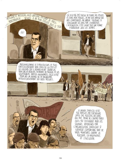 France, terre d'accueil. Même si la réalité est souvent assez éloignée de ce grand principe, Christophe Dabitch a recueilli le témoignage de 11 immigrants, ayant trouvé asile en France. Ces témoignages dessinés sont éclairés par six textes d'historiens, spécialistes de la question, qui replacent les raisons de l'immigration dans l'histoire de notre pays. Au XXe siècle, la France a été l'un des principaux pays d'immigration dans le monde. Cet aspect de notre histoire contemporaine a longtemps été refoulé de la mémoire collective. Aujourd'hui, le vieux stéréotype «nos ancêtres, les Gaulois» tend à disparaître. Mais d'autres préjugés se sont installés, notamment l'idée que les immigrants d'autrefois se seraient «bien intégrés», alors que ceux d'aujourd'hui «poseraient problème». L'histoire de l'immigration montre qu'en réalité, c'est toujours le dernier venu qui a été perçu comme le plus menaçant aux yeux des autochtones... Cet ouvrage n'a pas pour objectif d'être représentatif des différentes réalités vécues de l'immigration. Il s'agit de porter un regard sur quelques trajectoires singulières et, grâce au travail de réflexion des historiens, d'interroger quelques thématiques liées à l'immigration. Ils viennent de Roumanie, d'Angola, de Turquie, d'Uruguay... Pour des raisons économiques ou politiques ou de santé, leurs parents, ou eux-mêmes, ont dû quitter leur pays pour la France. Ce livre raconte leur intégration, qui passe très souvent par une phase de «racisme ordinaire». Benjamin Flao dessine Hélène, arrivée d'Angola. Elle a quitté son pays à cause des tortures subies. «Je veux encore rajouter: quand les gens viennent demander asile à un pays, la plupart ne viennent pas pour rien, ni pour l'envie de vivre en Europe.». Kkrist Mirror dessine Misa, venu de Roumanie pour faire soigner sa fille. «Quand on est arrivés en France, c'était une vie difficile pour nous. Je ne savais pas parler le français, on ne savait où aller travailler. Je faisais la manche. Je n'avais pas d'autre choix. Dans ma famille, on ne vole pas.». Troub's dessine Jamshid, venu d'Iran pour faire son doctorat. «J'avais une vision féerique et idéaliste de la France. Je croyais que je pouvais parler avec n'importe qui de Stendhal, Malraux, de la Commune de Paris... Au début, ça m a chagriné de voir qu'il y avait une grande partie des Français qui étaient incultes, je me demandais pourquoi.». Jeff Pourquié dessine Gambie, arrivé de Sierra Leone. Député et ministre, lorsque l'armée prend le pouvoir, il doit fuir. «Au Pôle Emploi, on m'a dispensé de rechercher un travail vu mon âge (55 ans). Mais je voulais travailler et apporter quelque chose à mon nouveau pays. Ca fait 5 ans que je travaille comme employé de nuit dans deux hôtels.». Simon Hureau dessine Naïma, venue du Maroc avec ses parents qui ne pouvaient plus nourrir la famille. «Pour moi le travail, la réussite scolaire, ça a toujours été comme un passeport. Tu vois tous ces livres, c'est à eux que je dois l'essentiel...». Christophe Gaultier dessine Anna, née en Uruguay, qui a quitté le Chili pour fuir le régime politique. «Vous êtes blessée moralement, économiquement, vous êtes loin de votre famille et on vous dit que vous venez manger le pain des Français.». Manuele Fior dessine N'Guyen, née au Laos, réfugiée à Taïwan pendant 28 ans, elle rejoint finalement sa fille, son mari et leurs deux enfants nés en France. «On travaille tous dans le même resto japonais. Les Français n'y voient que du feu. Il y a une entraide entre nous, c'est pour ça qu'on se retrouve entassés dans des appartements à disons 10, 15 ou 20 personnes. »...