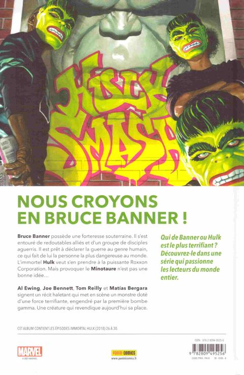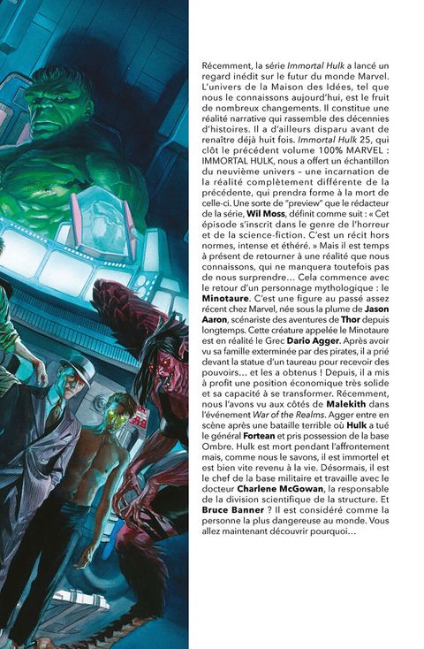 Il y a un nouveau Hulk en ville... et il veut sauver le monde ! Quel est ce nouveau mystère et que viennent faire la multinationale Roxxon et son terrible chef, le minotaure Dario Agger, là-dedans ? En plus, le retour de l'un des plus terribles adversaires de Bruce Banner / Hulk : Samuel Sterns, alias le Leader. Peut-il y avoir une fin heureuse pour l'Immortel Hulk ? Al Ewing continue son parcours sur l'une des séries Marvel les plus appréciées du moment. Dans ce volume, un épisode 33 gigantesque qui fête le 750ème numéro de la série, tous relaunchs confondus ! Et toujours : les superbes couvertures d'Alex Ross !