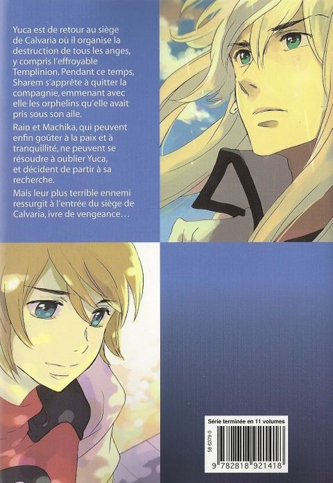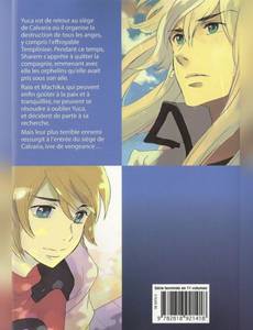Yuca est de retour au siège de Calvaria où il organise la destruction de tous les anges, y compris l’effroyable Templinion. Pendant ce temps, Sharem s’apprête à quitter la compagnie, emmenant avec elle les orphelins qu’elle avait pris sous son aile. Rain et Machika, qui peuvent enfin goûter à la paix et à tranquillité, ne peuvent se résoudre à oublier Yuca, et décident de partir à sa recherche. Mais leur plus terrible ennemi ressurgit à l’entrée du siège de Calvaria, ivre de vengeance… Vous trouverez également à la fin de ce volume deux histoires spéciales : “La princesse du pays des orphelins” et la “Le prince du pays des orphelins”.