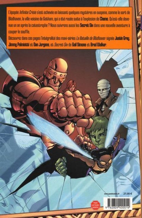 l'épopée infinite crisis s'est achevée en laissant quelques mystères en suspens, comme le sort de blüdhaven, la ville voisine de gotham, qui a été rasée suite à l'explosion de chemo. qu'est-elle devenue un an après la catastrophe ? nous suivrons aussi les secret six dans une nouvelle aventure à couper le souffle. découvrez dans ces pages l'intégralité des maxi-séries la bataille de blüdhaven signée justin gray, jimmy palmiotti et dan jurgens, et secret six de gail simone et brad walker.