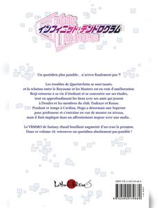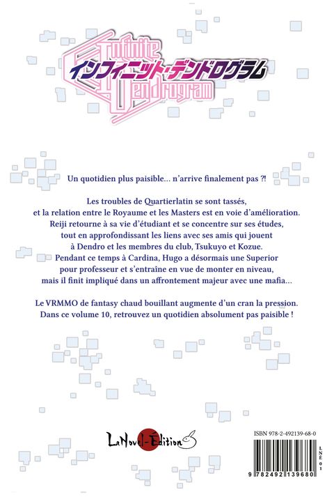 Un quotidien plus paisible… n’arrive finalement pas ?! Les troubles de Quartierlatin se sont tassés, et la relation entre le Royaume et les Masters est en voie d’amélioration. Reiji retourne à sa vie d’étudiant et se concentre sur ses études, tout en approfondissant les liens avec ses amis qui jouent à Dendro et les membres du club, Tsukuyo et Kozue. Pendant ce temps à Cardina, Hugo a désormais une Superior pour professeur et s’entraîne en vue de monter en niveau, mais il finit impliqué dans un affrontement majeur avec une mafia… Le VRMMO de fantasy chaud bouillant augmente d’un cran la pression. Dans ce volume 10, retrouvez un quotidien absolument pas paisible !