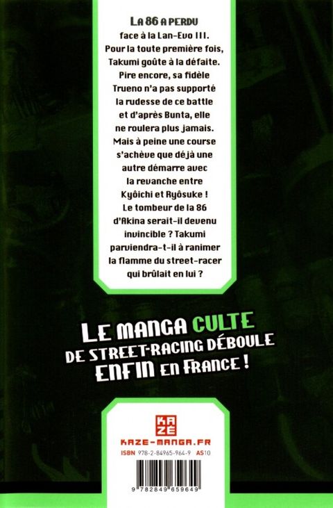 La 86 a perdu face à la Lan-Evo III. Pour la toute première fois, Takumi goûte à la défaite. Pire encore, sa fidèle Trueno n'a pas supporté la rudesse de ce battle et d'après Bunta, elle ne roulera plus jamais. Mais à peine une course s'achève que déjà une autre démarre avec la revanche entre Kyôichi et Ryôsuke ! Le tombeur de la 86 d'Akina serait-il devenu invincible ? Takumi parviendra-t-il à ranimer la flamme du street-racer qui brûlait en lui ?