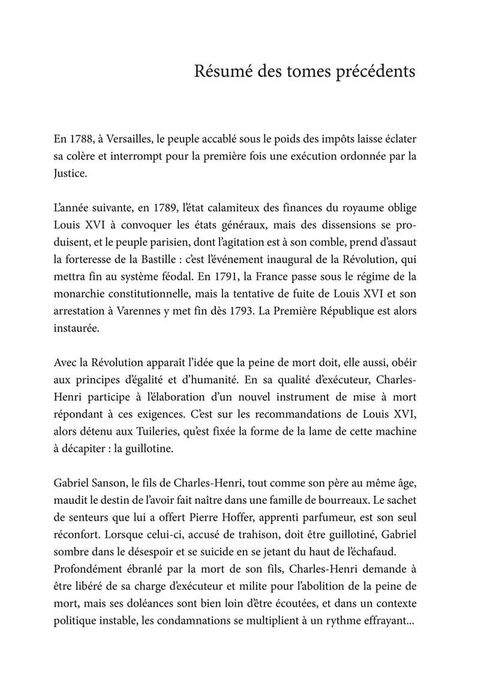 À l'aube de la Révolution, Charles-Henri Sanson, maître des hautes oeuvres de Paris, règne sur la famille des exécuteurs de France. Sa jeune soeur Marie-Josèphe, en charge de l'office de Versailles, devient incontrôlable à la mort d'Alain, son premier amour. Elle se jure de le venger en éliminant son assassin et ne recule devant rien pour renverser le système injuste qui lui a coûté la vie.