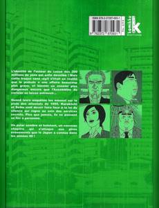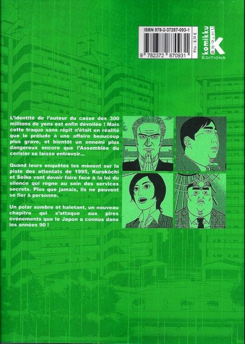 L'identité de l'auteur du casse des 300 millions de yens est enfin dévoilée ! Mais cette traque sans répit n'était en réalité que le prélude à une affaire beaucoup plus grave, et bientôt un ennemi plus dangereux encore que l'Assemblée du cerisier se laisse entrevoir... Quand leurs enquêtes les mènent sur la piste des attentats de 1995, Kurokôchi et Seike vont devoir faire face à la loi du silence qui règne au sein des services secrets. Plus que jamais, ils ne peuvent se fier à personne. Un polar sombre et haletant, un nouveau chapitre qui s'attaque aux pires événements que le Japon a connus dans les années 90 !