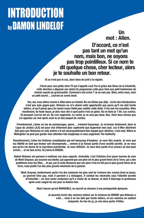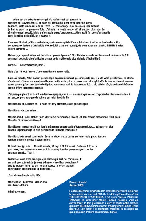 Un Tome 2 assez particulier Le tome 1 était super avec l'histoire d'invincible et de omni-man, dans celui ci on ce retrouve avec plusieurs intrigué non terminer, ça donne du potentiel pour la suite mais laisse un gros goût de frustration.