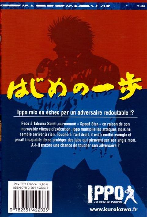 Face à Takuma Saeki, surnommé " Speed Star " en raison de son incroyable vitesse d'exécution, Ippo multiplie les attaques mais ne semble arriver à rien. Touché à l'oeil droit, il est à moitié aveuglé et paraît incapable de se protéger des jabs qui pleuvent sur son angle mort. A-t-il encore une chance de toucher son adversaire ?